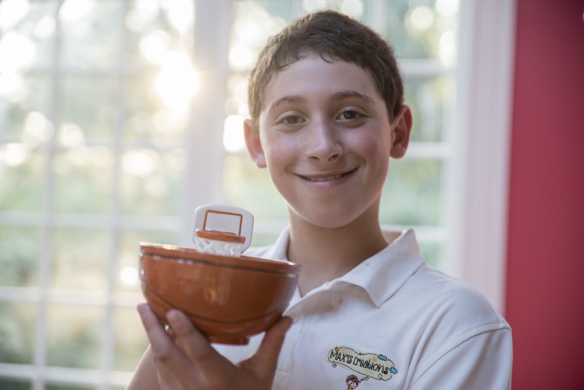 Max’s feature idea all started in his 2nd grade art class when he was instructed to make a mug out of clay. While his classmates diligently shaped their pieces in the expected pattern, Max took a fun turn by adding a miniature basketball hoop to the mug’s bowl so he could score points landing marshmallows in his hot chocolate. Recognizing the potential of The Mug With A Hoop™, Max and his parents contacted Sean O’Reilly at 3D Printsmith to design a prototype using 3D printing technology. “I knew [it] was a good idea when my friends copied me,” said Max, now 11, who received a patent for his design this past spring.