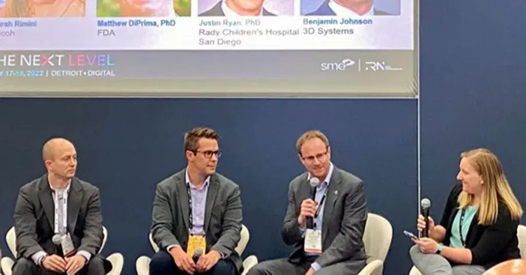In a Town Hall event during Rapid + TCT, 3D Systems’ Vice President, Portfolio and Regulatory, Ben Johnson participated in a panel discussion covering the current and future state of 3D printing at the point-of-care. Ricoh’s Sarah Rimini was the panel moderator and Ben joined other industry experts Matthew Di Prima, PhD of the FDA, and Justin Ryan, PhD of Rady Children’s Hospital San Diego.