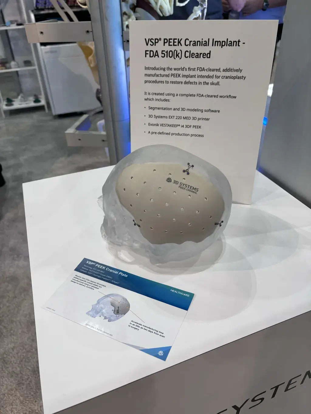 The recent FDA 510(k) clearance of 3D Systems' VSP® PEEK Cranial Implant marks a significant milestone in 3D printing in healthcare as it paves the regulatory pathway for other 3D-printed implants using PEEK. By leveraging the EXT 220 MED printer, software and process used for the cranial plate solution, our expert team can help device manufacturers expedite product development as well as the process to gain clearance for their own implants.