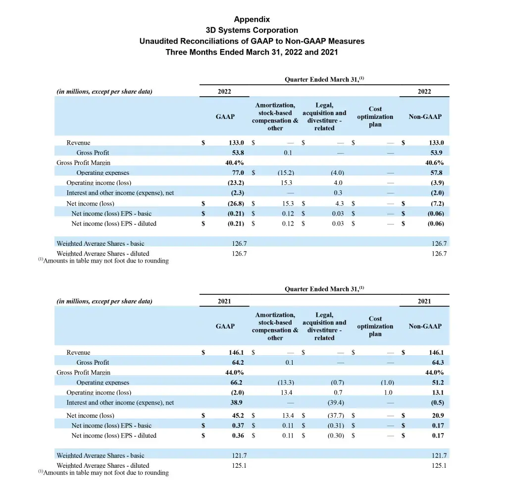 3D Systems reports its financial results in accordance with GAAP. Management also reviews and reports certain non-GAAP measures, including: non-GAAP revenue, non-GAAP Gross profit, non-GAAP Gross profit margin, non-GAAP Operating expenses, non-GAAP Operating (loss)/income, non-GAAP Interest and other income/(expense), net, non-GAAP Net income (loss), non-GAAP Basic and Diluted Income (Loss) per Share, adjusted EBITDA and adjusted EBITDA Margin. These non-GAAP measures exclude certain special items that management does not view as part of 3D Systems’ underlying results as they may be highly variable, may be unusual or infrequent, are difficult to predict and can distort underlying business trends and results. Management believes that the non-GAAP measures provide useful additional insight into underlying business trends and results and provide a more meaningful comparison of period-over-period results. Additionally, management uses the non-GAAP measures for planning, forecasting and evaluating business and financial performance, including allocating resources and evaluating results relative to employee compensation targets. 3D Systems’ non-GAAP measures are not calculated in accordance with or as required by GAAP and may not be calculated the same as similarly titled measures used by other companies. These non-GAAP measures should thus be considered as supplemental in nature and not considered in isolation or as a substitute for the related financial information prepared in accordance with GAAP.