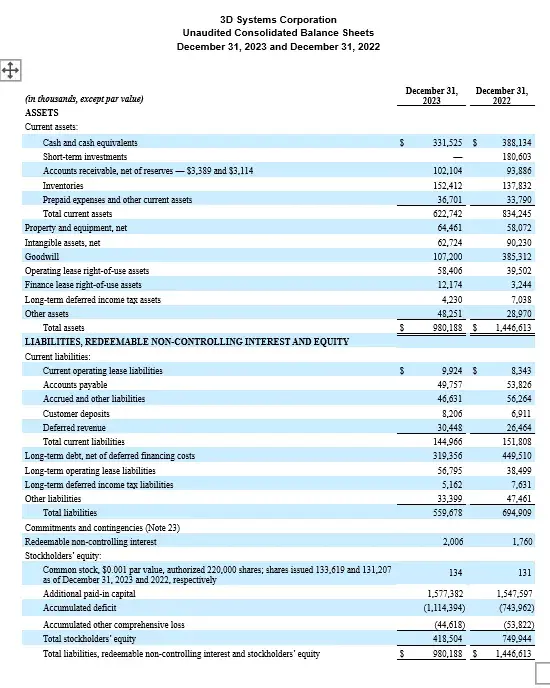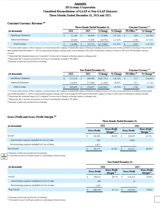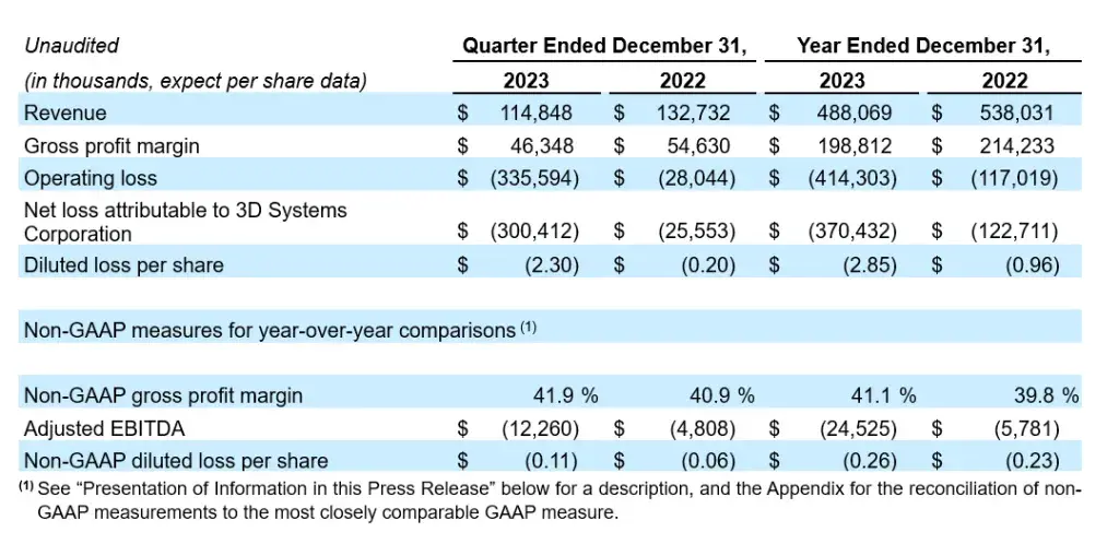 ROCK HILL, South Carolina - February 27, 2024 - 3D Systems Corporation (NYSE:DDD) announced today its financial results for the fourth quarter and full year ended December 31, 2023.