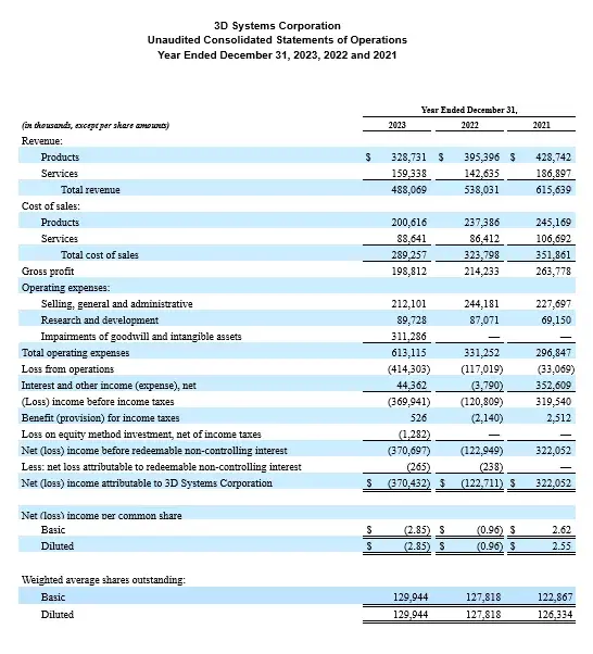 Net loss attributable to 3D Systems Corporation for the full year 2023 increased by $247,721 to a loss of $370,432 compared to the prior year.  The increase in net loss attributable to 3D Systems Corporation primarily reflects an impairment of goodwill and other intangible assets, lower revenue and an increase in operating expenses associated with investments in our Regenerative Medicine business and an increase in consulting and outside services expenses.