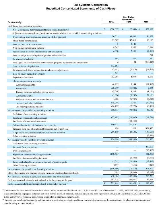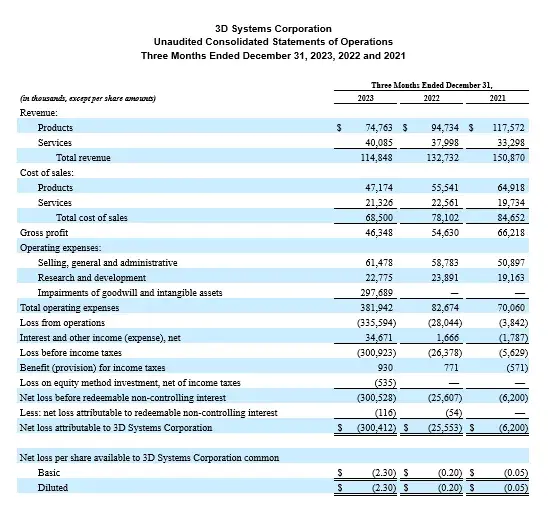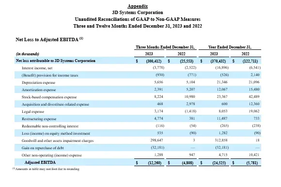 Net loss attributable to 3D Systems Corporation increased by $274,859 to a loss of $300,412 in the fourth quarter of 2023 compared to the same period in the prior year.  The increase in net loss attributable to 3D Systems Corporation primarily reflects $297,689 related to the impairment of goodwill and other intangible assets.