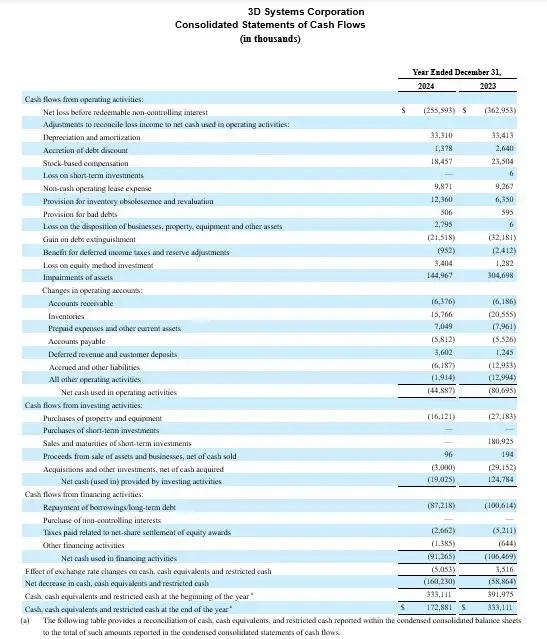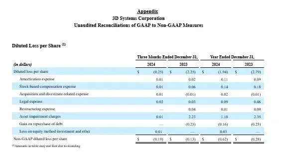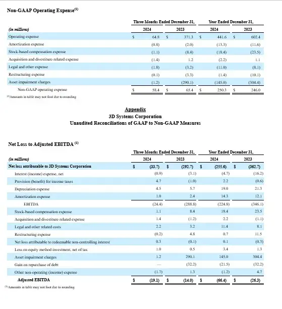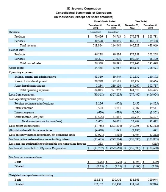 Net loss attributable to 3D Systems Corporation improved by $259.0 million to a loss of $33.7 million in the fourth quarter of 2024 compared to the same period in the prior year. The improvement in net loss primarily reflects the year-over-year change in impairment of goodwill and other intangible assets taken during the prior year period.