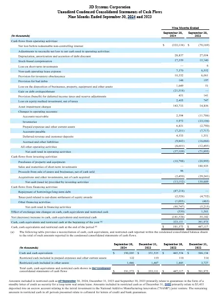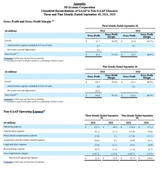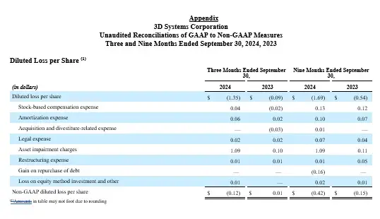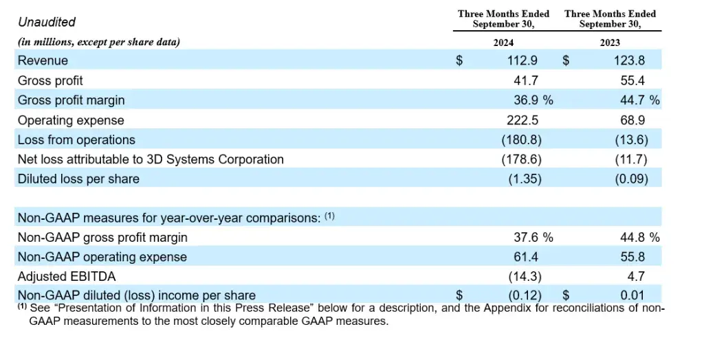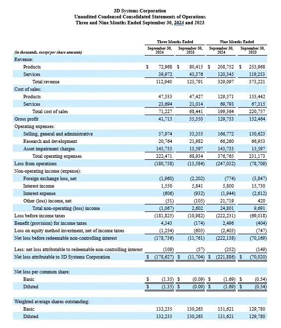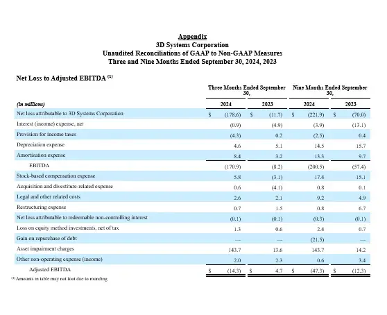 Net loss attributable to 3D Systems Corporation for the third quarter of 2024 was $178.6 million compared to a net loss of $11.7 million for the same period last year. The decline from prior year was primarily impacted by the previously referenced $143.7 million associated with the impairment of goodwill and other long-lived assets taken during the third quarter of 2024.