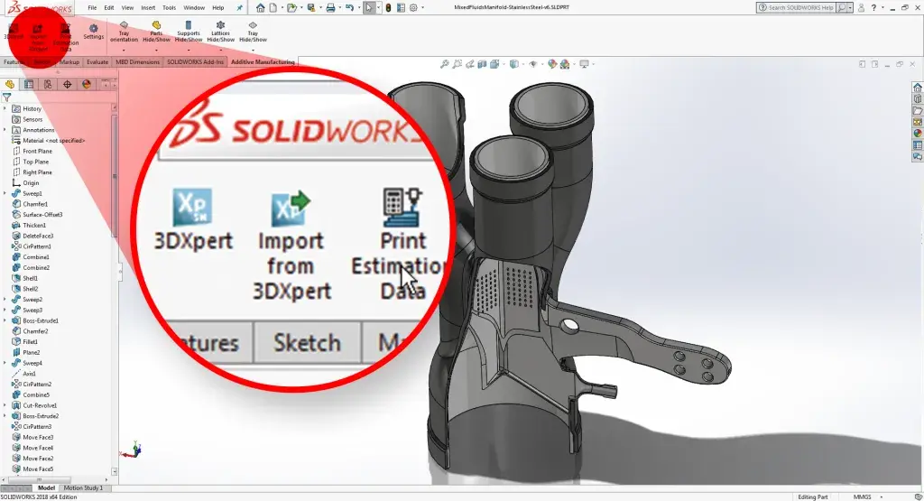 3DXpert for SOLIDWORKS is an add-on for SOLIDWORKS, extending SOLIDWORKS’ design capabilities with a complete DfAM toolset, equipping designers with everything they need to prepare and optimize their designs for 3D printing.