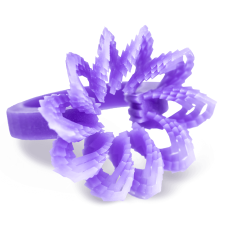 The VisiJet M3 RealWax material used by the ProJet MJP Series produces high-definition parts with crisp details and a smooth surface finish. The support material is easy to remove in post-processing and preserves the ring’s delicate features.