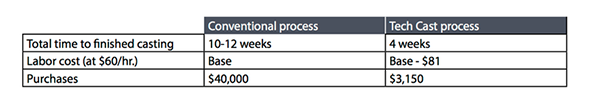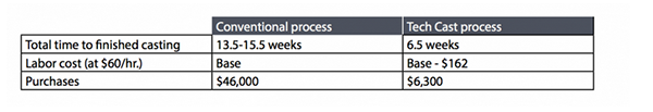 The following table compares the Tech Cast process to the conventional process for this impeller.
