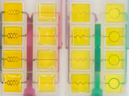Section of an h-VIOS32 plate containing an array of vascularized hydrogels with different architectures.