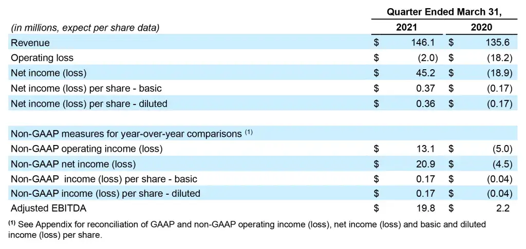 - Q1 2021 revenue increased by 7.7% to $146.1 million, compared to $135.6 million in Q1 2020