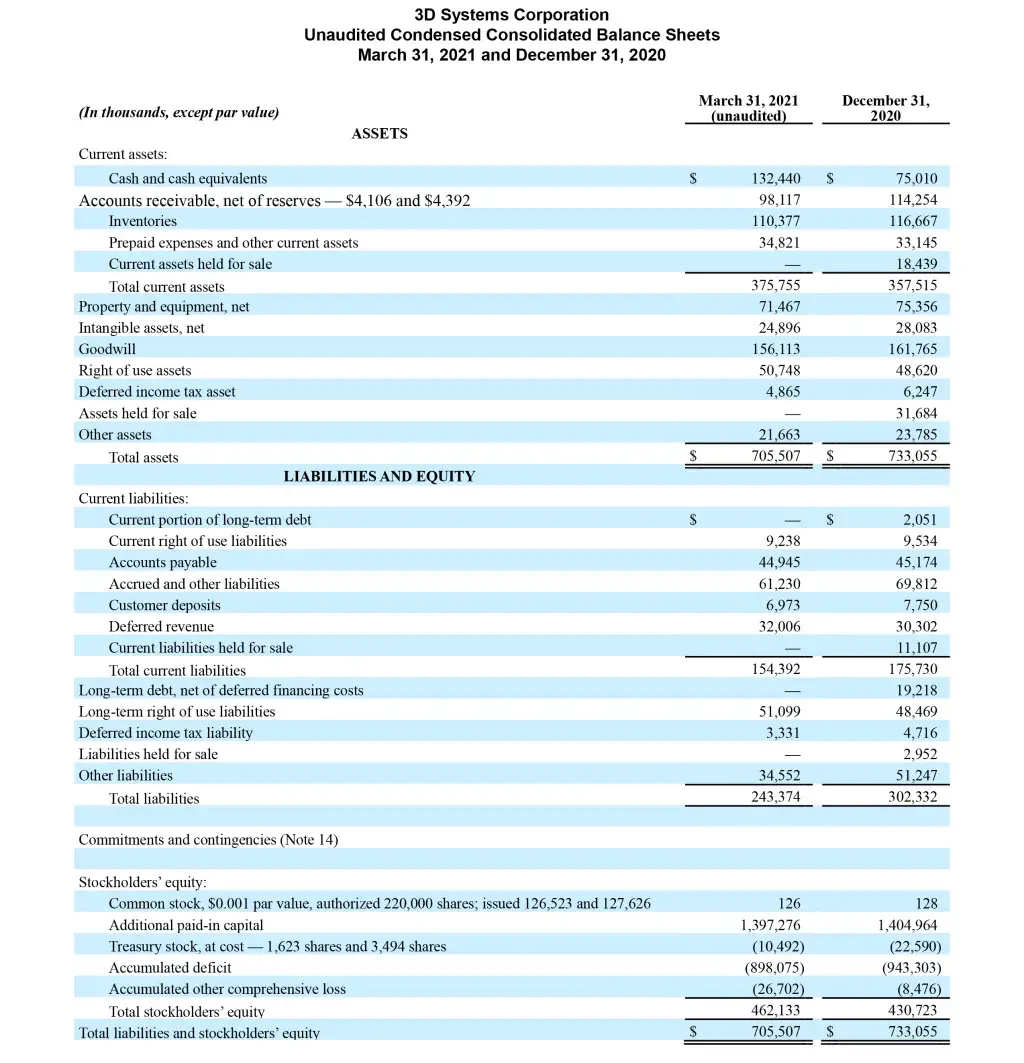ROCK HILL, South Carolina - May 10, 2021 - 3D Systems Corporation (NYSE:DDD) announced today its financial results for the first quarter ended March 31, 2021.