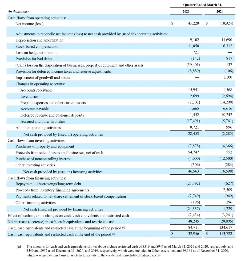 At March 31, 2021, the company had cash on hand of $133.0 million including restricted cash, no debt and a $100 million unused revolving credit facility with approximately $92.0 million of availability based on the terms of the agreement. Cash on hand has increased $48.2 million since December 31, 2020, driven primarily by net proceeds from divestitures of $54.7 million and cash generated from operations of $28.5 million, offset by a debt repayment of $21.4 million and other financing and investing uses of cash.
