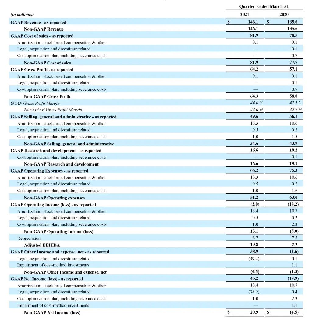 Operating expenses decreased 12.1% to $66.2 million in the first quarter of 2021, compared to the same period a year ago. On a non-GAAP basis, operating expenses were $51.2 million, an 18.7% decrease from the first quarter of the prior year. The lower non-GAAP operating expenses reflect savings achieved from cost restructuring activities.