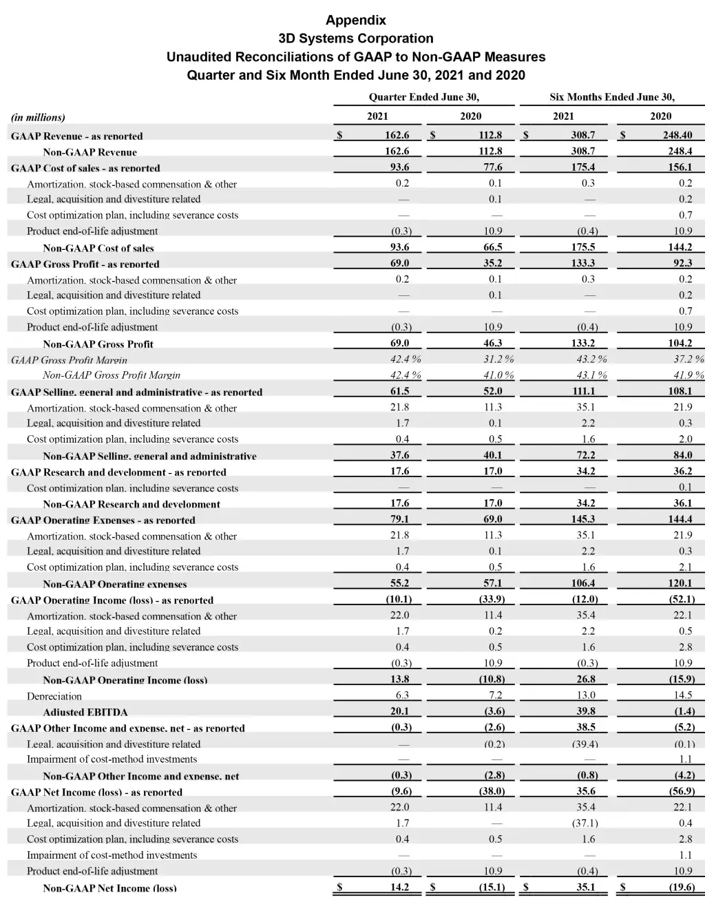 3D Systems reports is financial results in accordance with GAAP. To facilitate a better understanding of the impact that strategic acquisitions, non-recurring charges and certain non-cash expenses had on its financial results, management reviews certain non-GAAP measures, including non-GAAP revenue, non-GAAP Cost of Sales, non-GAAP Operating Income, non-GAAP Net Income (Loss), non-GAAP Basic and Diluted Income (Loss) per Share, non-GAAP Gross Profit, non-GAAP Gross Profit Margin, non-GAAP SG&A Expenses, non-GAAP R&D, non-GAAP Other Income and Expense and non-GAAP Operating Expenses, each of which exclude the impact of amortization of intangibles, acquisition and severance expenses, stock-based compensation expense, litigation settlements and charges related to strategic decisions and portfolio realignment, and Adjusted EBITDA, defined as non-GAAP Operating Income plus depreciation, and Adjusted EBITDA Margins to better evaluate period-over-period performance. A reconciliation of GAAP to non-GAAP results is provided in the accompanying schedule.