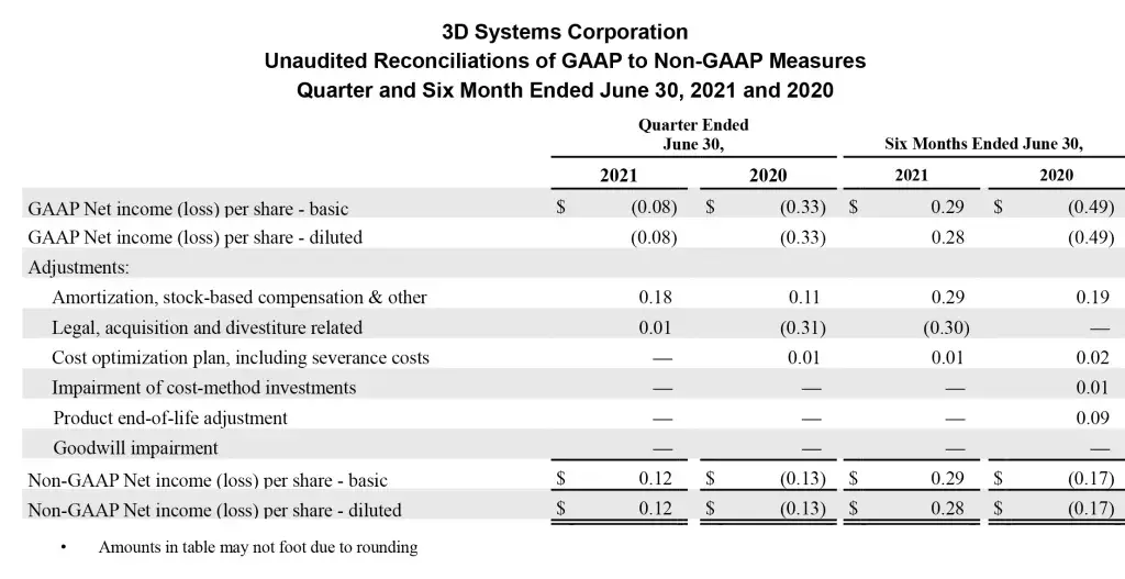 3D Systems does not provide forward-looking guidance on a GAAP basis. The company is unable to provide a quantitative reconciliation of these forward-looking non-GAAP measures to the most directly comparable forward-looking GAAP measures without unreasonable effort because 3D Systems cannot reliably forecast legal, acquisition and divestiture expenses, restructuring expenses, product end of life adjustments and goodwill impairment, which are difficult to predict and estimate. These items are inherently uncertain and depend on various factors, many of which are beyond the company’s control, and as such, any associated estimate and its impact on GAAP performance could vary materially.