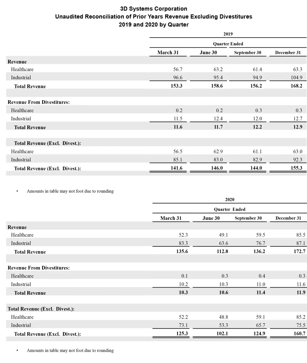 Certain statements made in this release that are not statements of historical or current facts are forward-looking statements within the meaning of the Private Securities Litigation Reform Act of 1995. Forward-looking statements involve known and unknown risks, uncertainties and other factors that may cause the actual results, performance or achievements of the company to be materially different from historical results or from any future results or projections expressed or implied by such forward-looking statements, including the ability to consummate the divestiture of non-core assets as expected. In many cases, forward looking statements can be identified by terms such as “believes,” “belief,” “expects,” “may,” “will,” “estimates,” “intends,” “anticipates” or “plans” or the negative of these terms or other comparable terminology. Forward-looking statements are based upon management’s beliefs, assumptions and current expectations and may include comments as to the company’s beliefs and expectations as to future events and trends affecting its business and are necessarily subject to uncertainties, many of which are outside the control of the company. The factors described under the headings “Forward-Looking Statements” and “Risk Factors” in the company’s periodic filings with the Securities and Exchange Commission, as well as other factors, could cause actual results to differ materially from those reflected or predicted in forward-looking statements. Although management believes that the expectations reflected in the forward-looking statements are reasonable, forward-looking statements are not, and should not be relied upon as a guarantee of future performance or results, nor will they necessarily prove to be accurate indications of the times at which such performance or results will be achieved. The forward-looking statements included are made only as the date of the statement. 3D Systems undertakes no obligation to update or revise any forward-looking statements made by management or on its behalf, whether as a result of future developments, subsequent events or circumstances or otherwise, except as required by law.