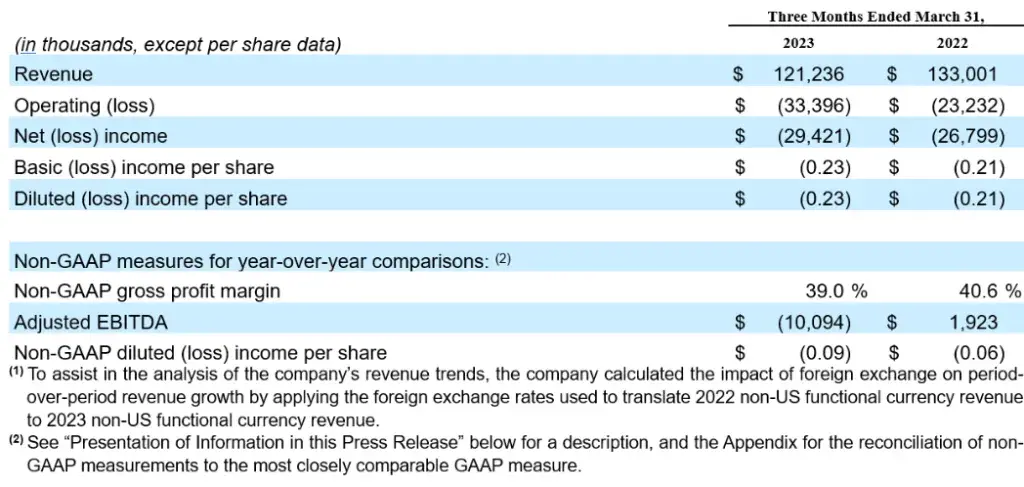 - Q1 2023 revenue of $121,236 decreased 8.8% compared to Q1 2022 a decrease of 6.5% on a constant currency basis(1)
