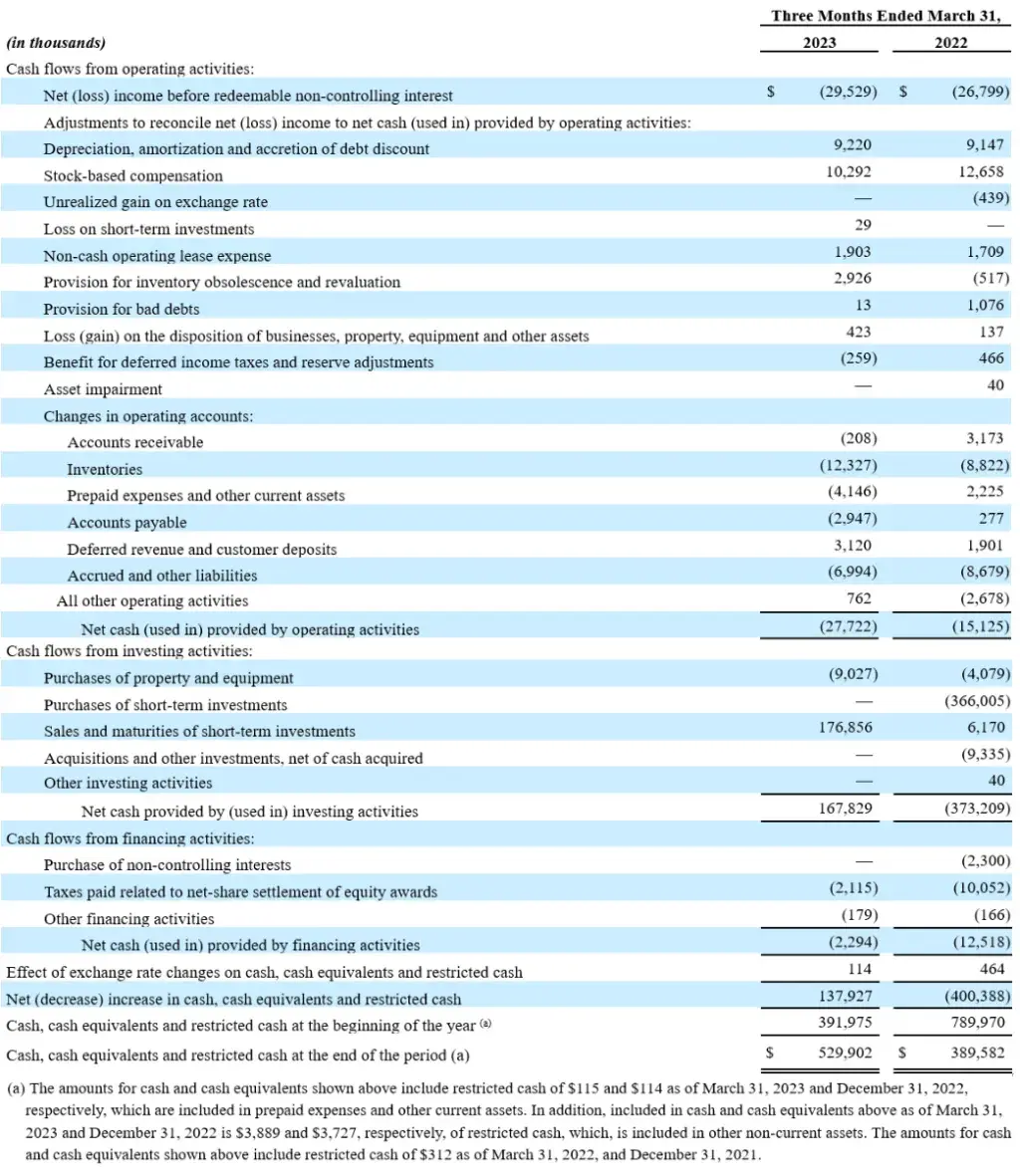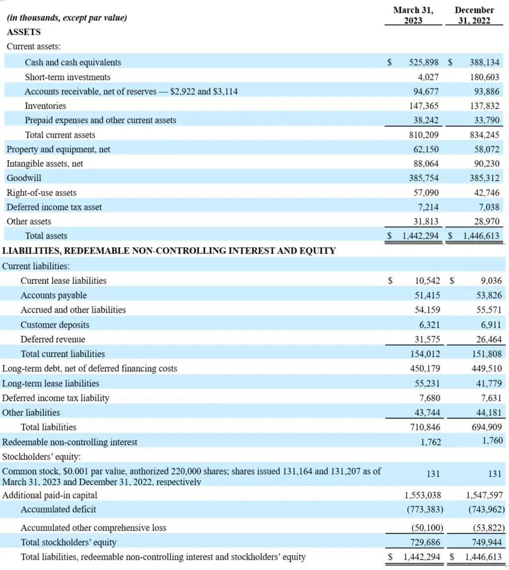 At March 31, 2023, the company had cash and cash equivalents and short-term investments of $529,925, a decrease of $38,812 since December 31, 2022. The decrease resulted primarily due to cash used in operations of $27,722, capital expenditures of $9,027, and taxes paid related to net share settlement of equity awards of $2,115. At March 31, 2023, the company had total debt net of deferred financing costs of $450,179.