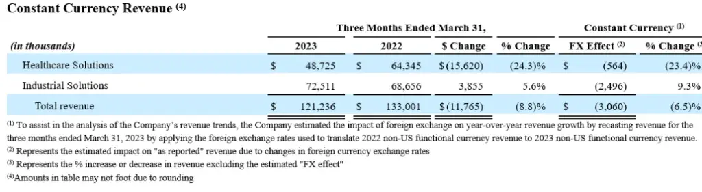 Healthcare Solutions revenue decreased 24.3% to $48,725 compared to the same period last year. Healthcare Solutions revenue on a constant currency basis decreased 23.4% year over year due to continued softness in our dental orthodontic market, which was down 46.2% versus the same period last year. Healthcare Solutions revenue from our non-dental markets increased 22.4% on a constant currency basis, versus the same period last year.
