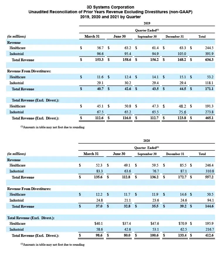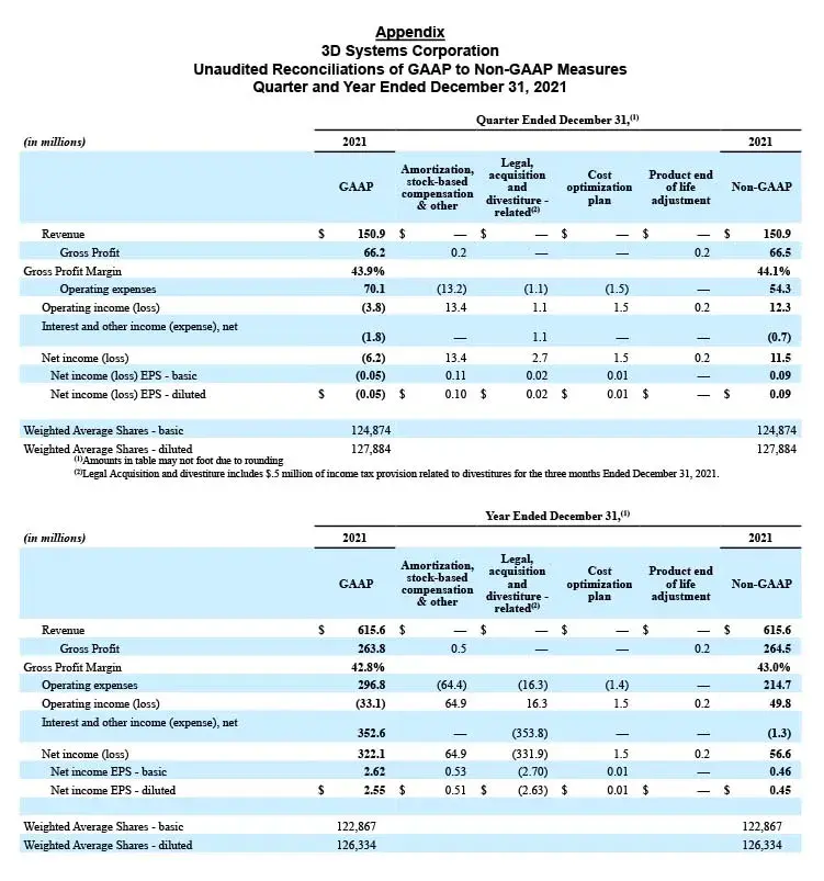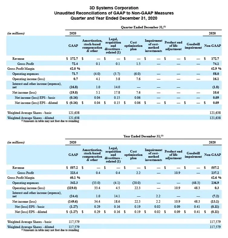 3D Systems reports its financial results in accordance with GAAP. Management also reviews and reports certain non-GAAP measures, including: non-GAAP revenue, non-GAAP Gross profit, non-GAAP Gross profit margin, non-GAAP Operating expenses, non-GAAP Operating (loss)/income, non-GAAP Interest and other income/(expense), net, non-GAAP Net income (loss), non-GAAP Basic and Diluted Income (Loss) per Share, adjusted EBITDA and adjusted EBITDA Margin. These non-GAAP measures exclude certain special items that management does not view as part of 3D Systems’ underlying results as they may be highly variable, may be unusual or infrequent, are difficult to predict and can distort underlying business trends and results. Management believes that the non-GAAP measures provide useful additional insight into underlying business trends and results and provide a more meaningful comparison of period-over-period results. Additionally, management uses the non-GAAP measures for planning, forecasting and evaluating business and financial performance, including allocating resources and evaluating results relative to employee compensation targets. 3D Systems’ non-GAAP measures are not calculated in accordance with or as required by GAAP and may not be calculated the same as similarly titled measures used by other companies. These non-GAAP measures should thus be considered as supplemental in nature and not considered in isolation or as a substitute for the related financial information prepared in accordance with GAAP.