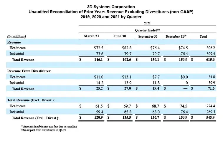 Revenue for 2021 of $615.6 million increased 10.5% compared to the prior year. Revenue adjusted for divestitures increased 31.8% compared to 2020, and 16.9% from pre-pandemic 2019, reflecting the successful strategy of divesting non-core assets and transforming into a company focused on delivering additive manufacturing solutions for Industrial and Healthcare Solutions customers. Both the Healthcare and Industrial Solutions segments contributed to the growth, with Healthcare revenue adjusted for divestitures increasing 40.1% and Industrial increasing 24.4% compared to 2020.