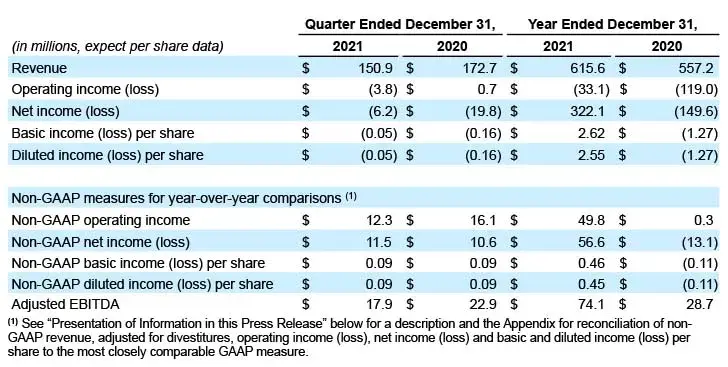 Operating expenses for the full year 2021 decreased 13.3% to $296.8 million compared to the prior year, primarily as a result of a goodwill impairment charge of $48.3 million and cost optimization charges of $20.1 million that both occurred in 2020. Non-GAAP operating expenses were $214.7 million in 2021, a 9.4% decrease from the prior year. The lower non-GAAP operating expenses are primarily a result of restructuring efforts done in late 2020 and businesses divested as part of the company’s strategic plan.
