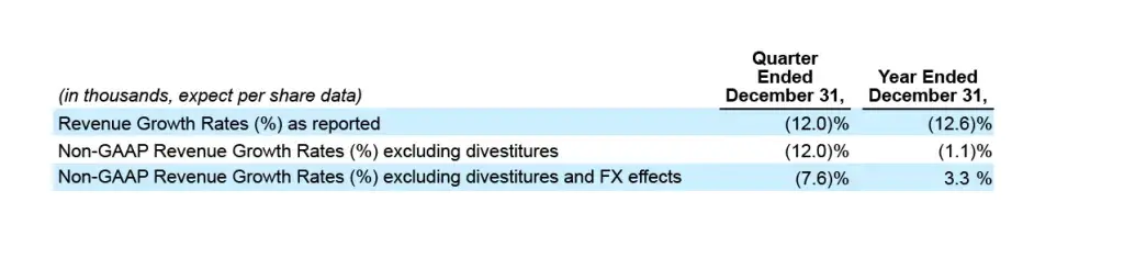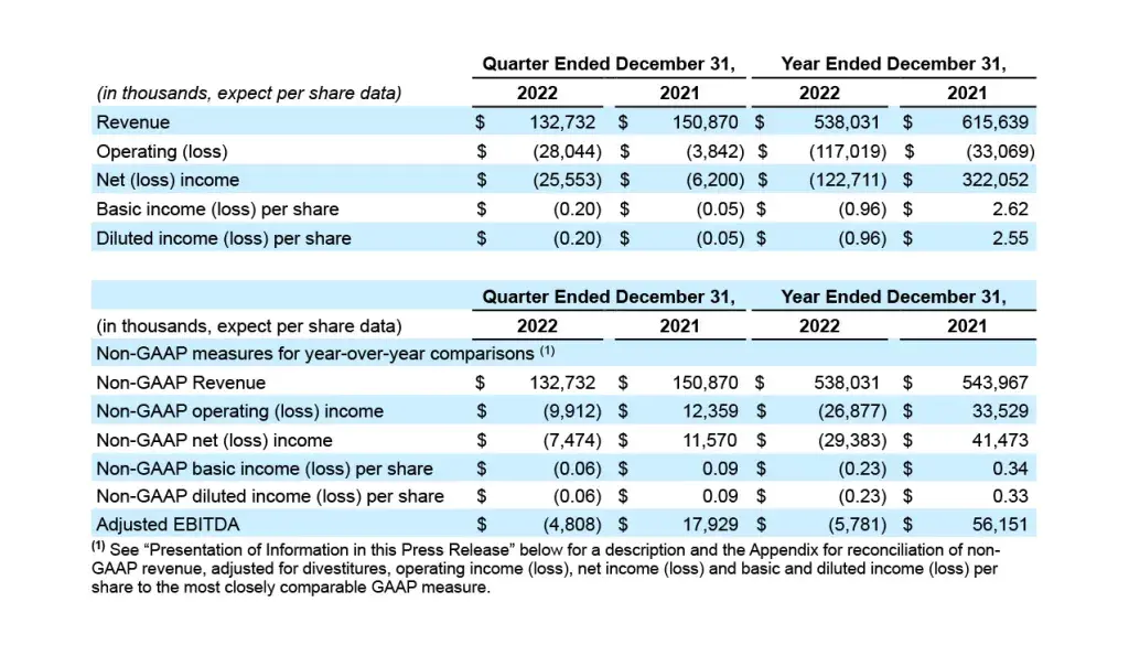 - 2022 revenue of $538,031 decreased 12.6% compared to 2021 revenue of $615,639; Non-GAAP revenue adjusted for divestitures and on a constant currency(1) basis increased 3.3%, reflecting solid demand in both the Industrial and Healthcare segments despite macroeconomic challenges, offset by lower sales to certain dental market customers