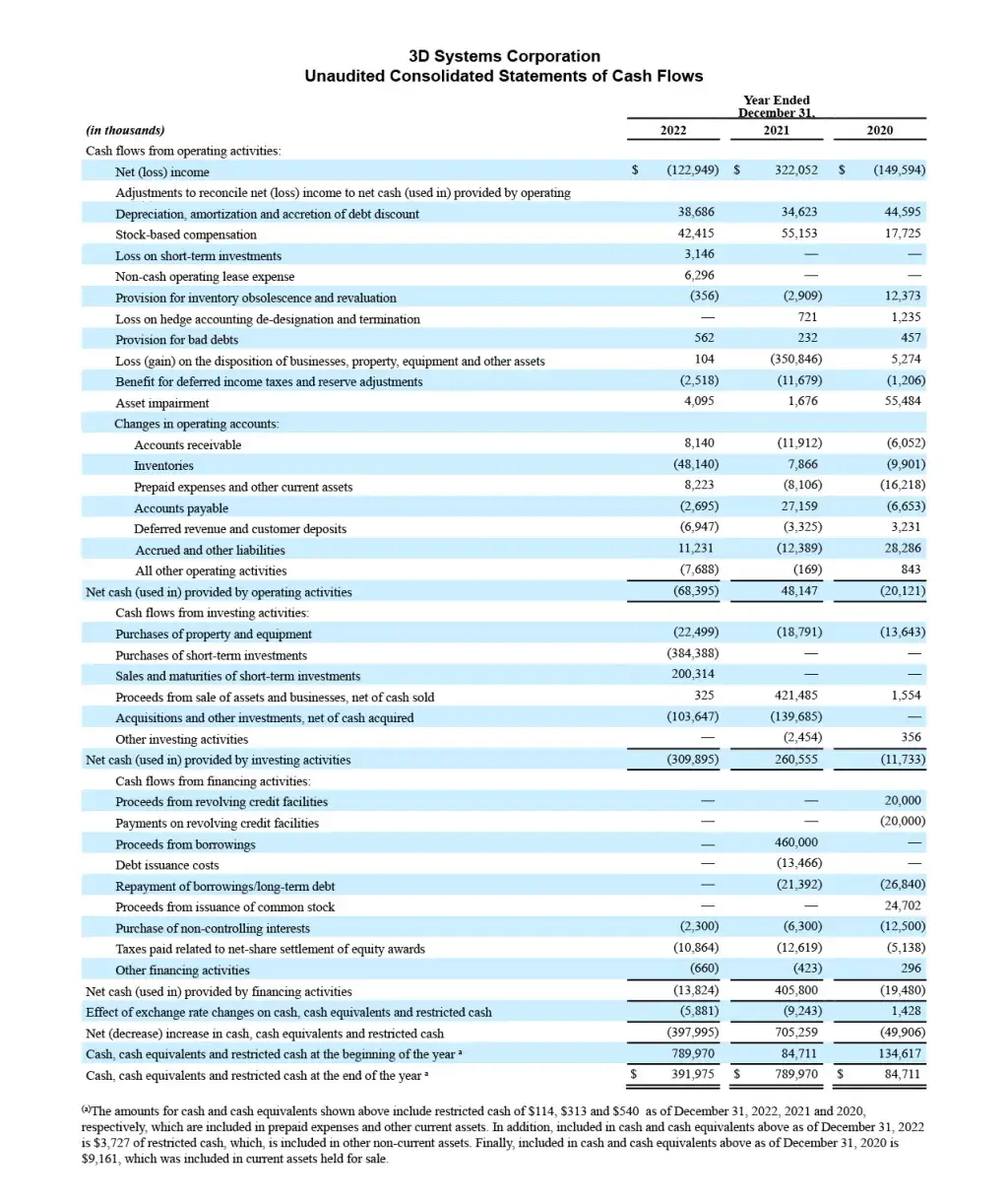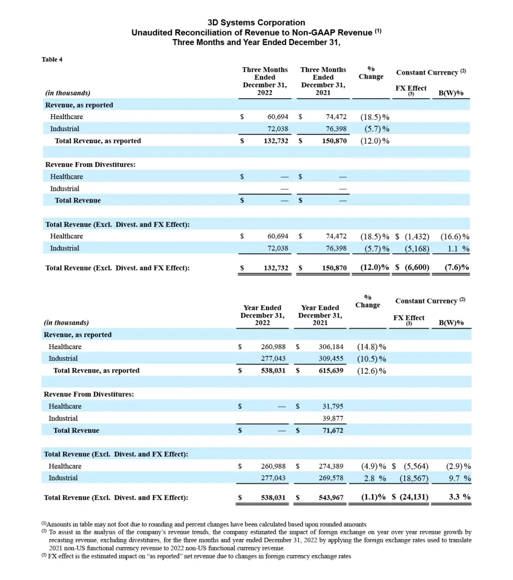 Commenting on 2022 results and the outlook for 2023, Dr. Jeffrey Graves, President and CEO of 3D Systems said, "2022 was a year of strong investment in our development of next generation hardware, materials, and software platforms despite facing significant macroeconomic and geopolitical headwinds as well as softness in our key dental orthodontic market attributable to inflationary pressure on consumer discretionary spending. By sustaining this investment focus, we made major progress on the refresh of our printer portfolio, as evidenced in part by recent new product announcements. More such announcements will follow throughout 2023 as we complete the refresh of virtually our entire product portfolio. This organic development was complemented by our acquisition of three early-stage technology platforms over the last 18 months, which further broadened the range of customer applications we can now address. Continuity in these initiatives was essential given the continued momentum we are seeing in the adoption of additive manufacturing in production environments across both our Healthcare and Industrial Solutions markets. Sustaining these investments in the face of 2022's many headwinds required us to target our investment spending carefully, control operating costs, and leverage our strong balance sheet. This focus, combined with our improved operational execution gained through selective in-sourcing of manufacturing, has reinforced our industry-leading breadth of additive manufacturing technologies, our unparalleled applications expertise, and scale needed to meet our expanding customer needs for years to come."