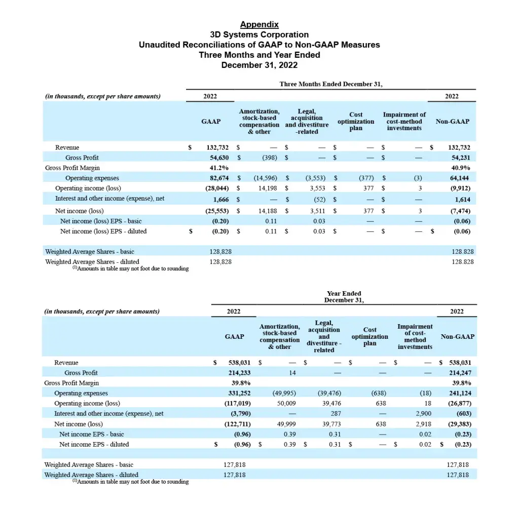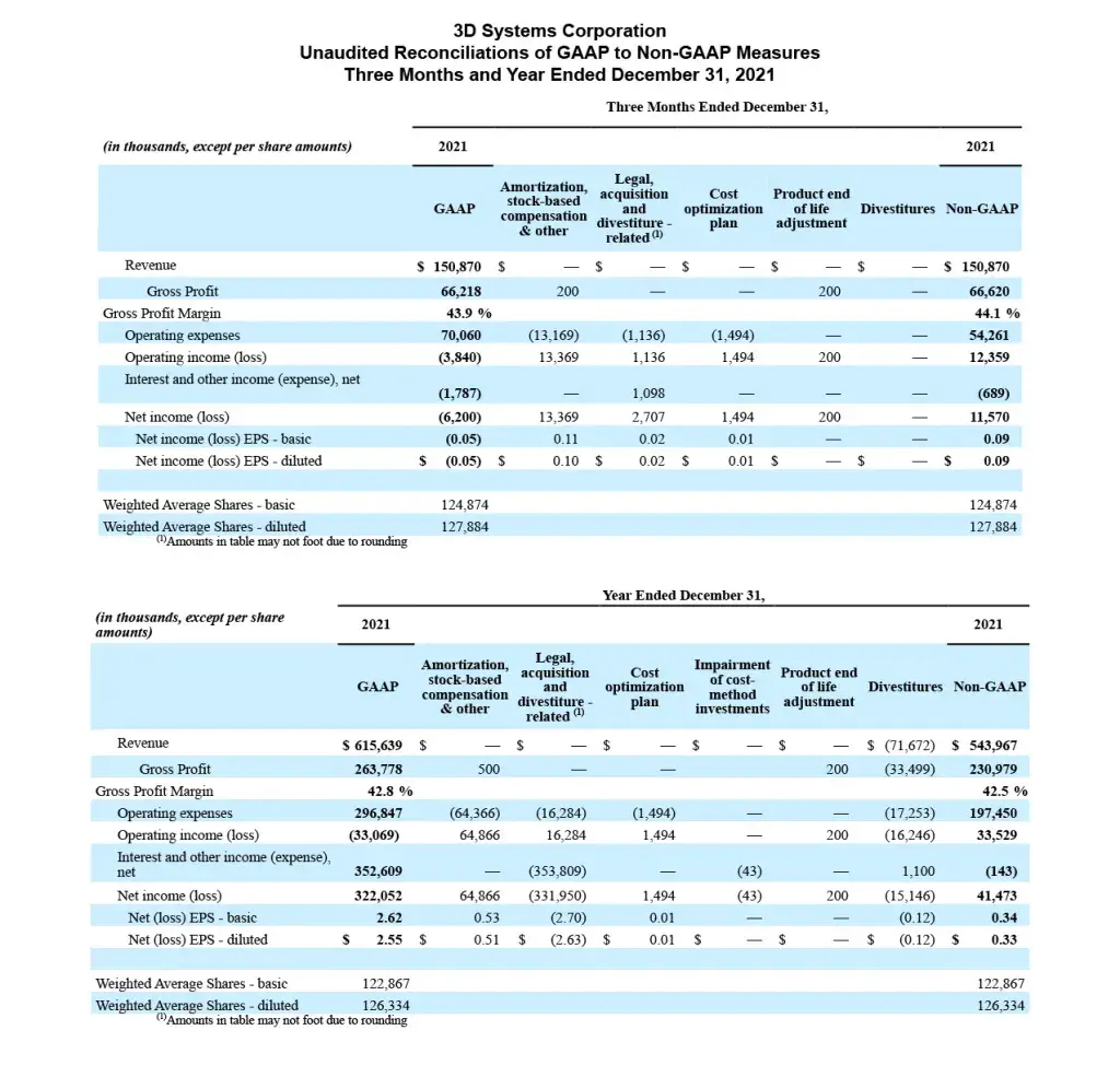 3D Systems reports its financial results in accordance with GAAP. Management also reviews and reports certain non-GAAP measures, including: non-GAAP revenue, non-GAAP Gross profit, non-GAAP Gross profit margin, non-GAAP Operating expenses, non-GAAP Operating (loss)/income, non-GAAP Interest and other income/(expense), net, non-GAAP Net income (loss), non-GAAP Basic and Diluted Income (Loss) per Share, adjusted EBITDA and adjusted EBITDA Margin. These non-GAAP measures exclude certain special items that management does not view as part of 3D Systems’ underlying results as they may be highly variable, may be unusual or infrequent, are difficult to predict and can distort underlying business trends and results. Management believes that the non-GAAP measures provide useful additional insight into underlying business trends and results and provide a more meaningful comparison of period-over-period results. Additionally, management uses the non-GAAP measures for planning, forecasting and evaluating business and financial performance, including allocating resources and evaluating results relative to employee compensation targets. 3D Systems’ non-GAAP measures are not calculated in accordance with or as required by GAAP and may not be calculated the same as similarly titled measures used by other companies. These non-GAAP measures should thus be considered as supplemental in nature and not considered in isolation or as a substitute for the related financial information prepared in accordance with GAAP.