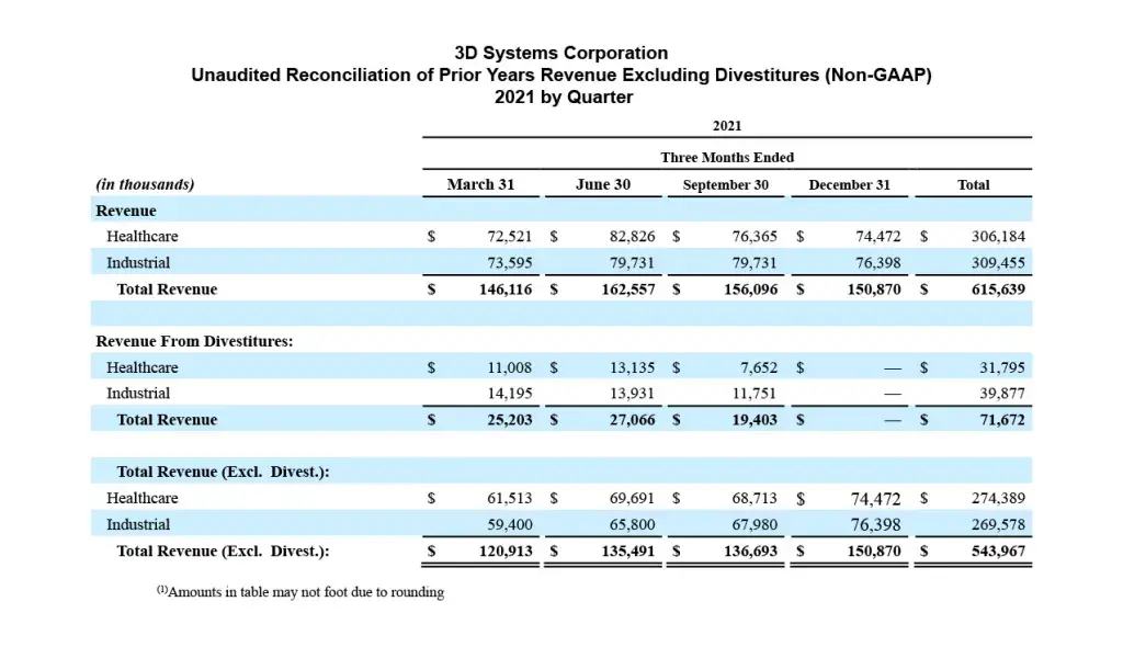 Amortization of intangibles, acquisition and divestiture related costs are excluded from non-GAAP measures as the timing and magnitude of business combination transactions are not predictable, can vary significantly from period to period and the purchase price allocated to amortizable intangible assets and the related amortization period are unique to each acquisition. Amortization of intangible assets will recur in future periods until such intangible assets have been fully amortized. While intangible assets contribute to the Company’s revenue generation, the amortization of intangible assets does not directly relate to the sale of the Company’s products or services. Additionally, intangible asset amortization expense typically fluctuates based on the size and timing of the Company’s acquisition activity. Accordingly, the Company believes excluding the amortization of intangible assets enhances the Company’s and investors’ ability to compare the Company’s past financial performance with its current performance and to analyze underlying business performance and trends. Although stock-based compensation is a key incentive offered to certain of our employees, we continue to evaluate our business performance excluding stock-based compensation; therefore, it is excluded from non-GAAP measures. Stock-based compensation expenses will recur in future periods. Restructuring charges (cost optimization plans), impairment charges, including goodwill, divestiture gains or losses, and severance charges pertaining to senior level employees, are excluded from non-GAAP measures as the frequency and magnitude of these activities may vary widely from period to period. Additionally, impairment charges, including goodwill, are non-cash. Furthermore, 3D Systems excludes contingent consideration recorded as compensation expense related to the 2021 Volumetric acquisition from non-GAAP measures as management evaluates financial performance excluding this expense, which is viewed by management as similar to acquisition consideration.