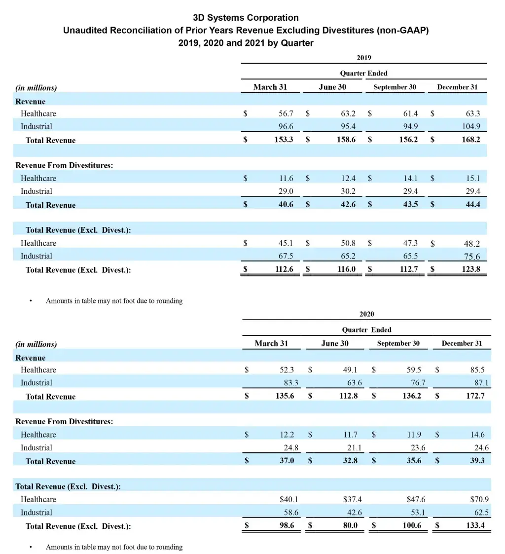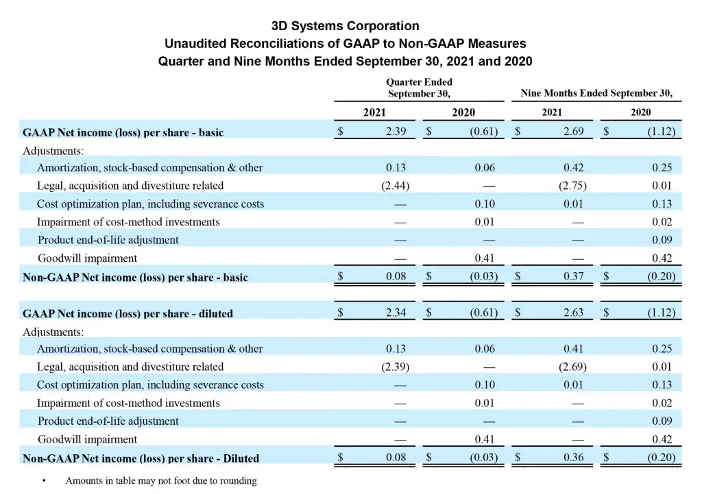 3D Systems does not provide forward-looking guidance on a GAAP basis. The company is unable to provide a quantitative reconciliation of these forward-looking non-GAAP measures to the most directly comparable forward-looking GAAP measures without unreasonable effort because 3D Systems cannot reliably forecast legal, acquisition and divestiture expenses, restructuring expenses, product end of life adjustments and goodwill impairment, which are difficult to predict and estimate. These items are inherently uncertain and depend on various factors, many of which are beyond the company’s control, and as such, any associated estimate and its impact on GAAP performance could vary materially.