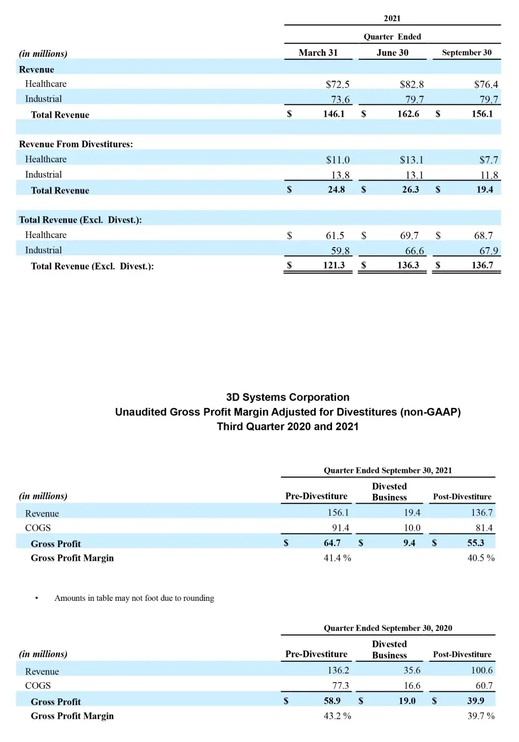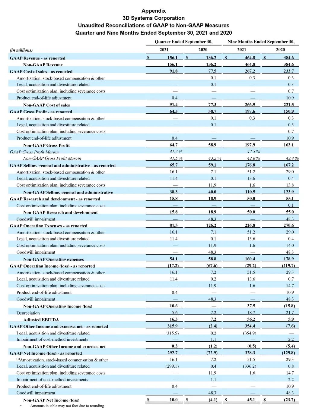 3D Systems reports is financial results in accordance with GAAP. To facilitate a better understanding of the impact that strategic acquisitions, non-recurring charges and certain non-cash expenses had on its financial results, management reviews certain non-GAAP measures, including non-GAAP revenue, non-GAAP revenue adjusted for divestitures, non-GAAP Cost of Sales, non-GAAP Operating Income, non-GAAP Net Income (Loss), non-GAAP Basic and Diluted Income (Loss) per Share, non-GAAP Gross Profit, non-GAAP Gross Profit Margin, non-GAAP Gross Profit Margin adjusted for divestitures, non-GAAP SG&A Expenses, non-GAAP R&D, non-GAAP Other Income and Expense and non-GAAP Operating Expenses, each of which exclude the impact of amortization of intangibles, acquisition and severance expenses, stock-based compensation expense, litigation settlements and charges related to strategic decisions and portfolio realignment, and Adjusted EBITDA, defined as non-GAAP Operating Income plus depreciation, and Adjusted EBITDA Margin, defined as Adjusted EBITDA divided by revenue, to better evaluate period-over-period performance. A reconciliation of GAAP to non-GAAP results is provided in the accompanying schedule.