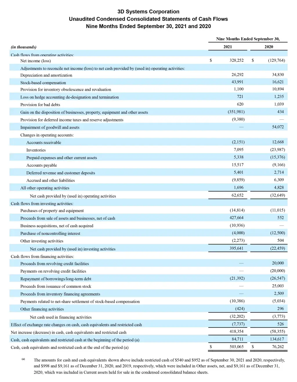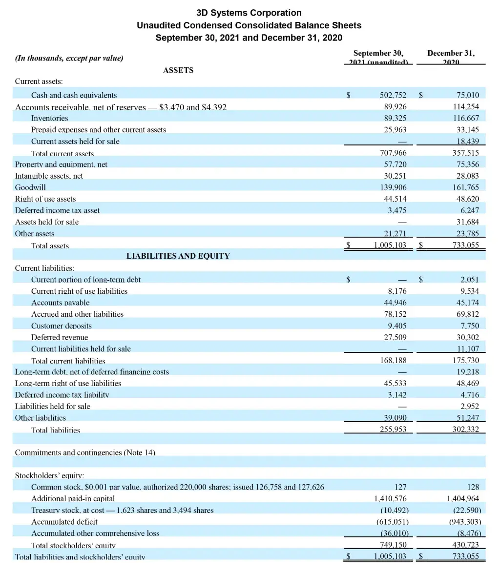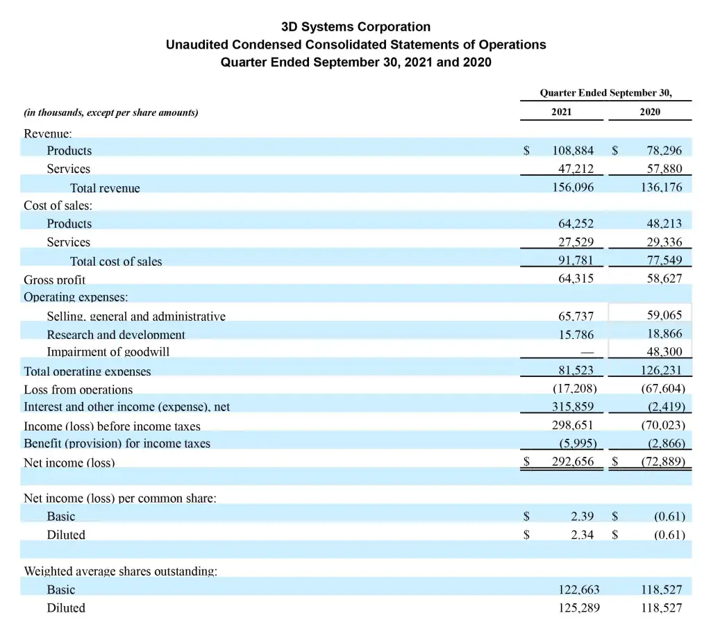 Commenting on the results, President and Chief Executive Officer, Dr. Jeffrey Graves said, “In the third quarter last year we experienced the beginnings of a recovery from the depths of the COVID-19 pandemic. Businesses were opening up, and customers were returning. A year later, global economies are much stronger. We still see continued challenges with COVID-19, and new challenges around supply chains, but thanks to the great work by our team here at 3D Systems, we are pleased to report another strong quarter of double-digit growth as compared to the same period in both 2020 and pre-pandemic 2019, adjusted for divestitures. While we were delivering these results through our core portfolio of business, we also completed our divestitures of non-core assets and began the transition to a strategic growth phase. Our focus during this phase is investing in significant opportunities that we believe will drive high-margin recurring revenue, as evidenced by our acquisition in the software space of Oqton, and the hiring of a new Chief Scientist to further advance our technology development. More recently we made two announcements in the exciting area of regenerative medicine: the acquisition of Volumetric Biotechnologies and the expansion of our development agreement with United Therapeutics to include two additional human organs. The acquisition brings unique biological talent to our organization, including a new Chief Scientist for Regenerative Medicine, that we believe will allow us to expand and accelerate our growth in human and laboratory applications for bioprinting. These investments in software, products platforms, and regenerative medicine compliment an existing business portfolio that generated $20.7 million in cash from operations during the third quarter to bolster a balance sheet that boasted $503 million of cash, ready to support additional growth.”