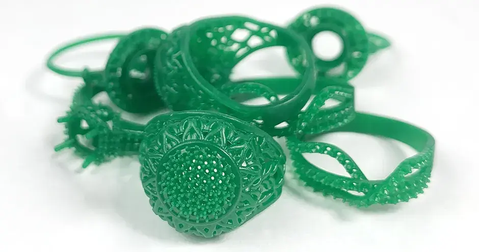 Jewelry casting patterns produced on the Figure 4 Jewelry printer with Figure 4 JCAST-GRN 10 material. With a print speed of 16 mm/hr at 30 um layer resolution and projection-based imaging, Figure 4 Jewelry can print a full platform of rings up to 4X faster than comparable printing systems.