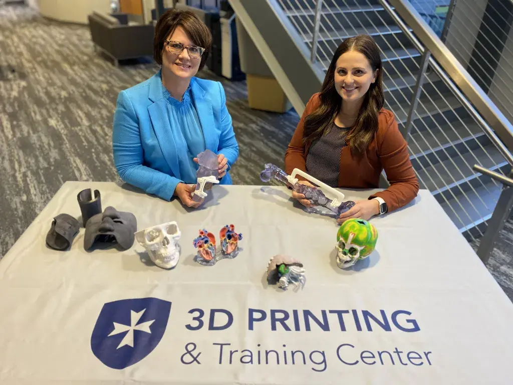 Clarkson College’s Assistant Director of Radiography/Medical Imaging and Advanced Technology Patricia (Trish) Weber (left) and 3D Printing and Training Center Administrator Blair Kauzlarich (right) showcase patient-specific boluses, surgical guides, and anatomic models 3D printed through the new partnership with 3D Systems.