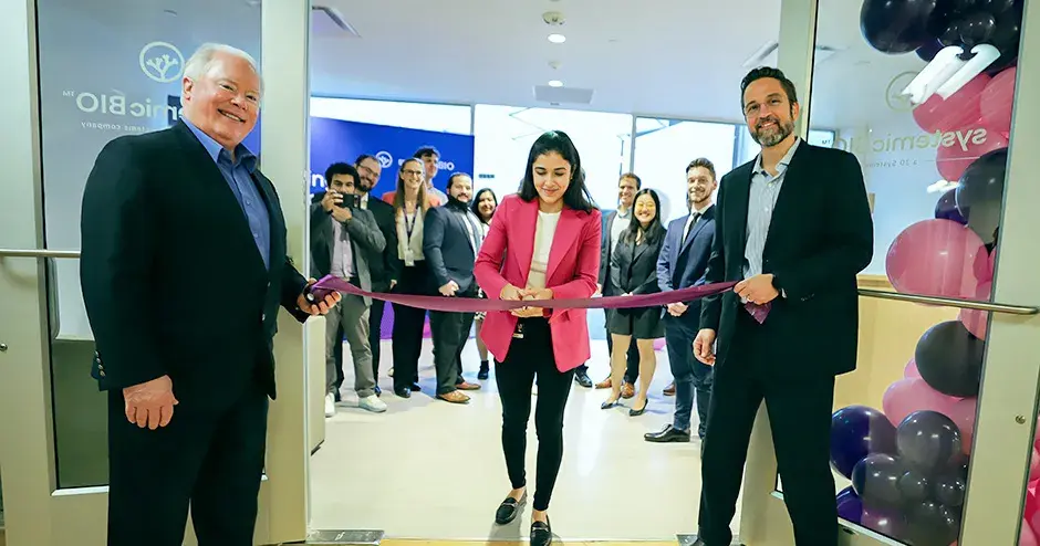(L-R) 3D Systems President & CEO, Dr. Jeffrey Graves, Systemic Bio CEO, Taci Pereira, & 3D Systems EVP, Healthcare Solutions, Menno Ellis along with the Systemic Bio team at the ribbon cutting of their new headquarters.