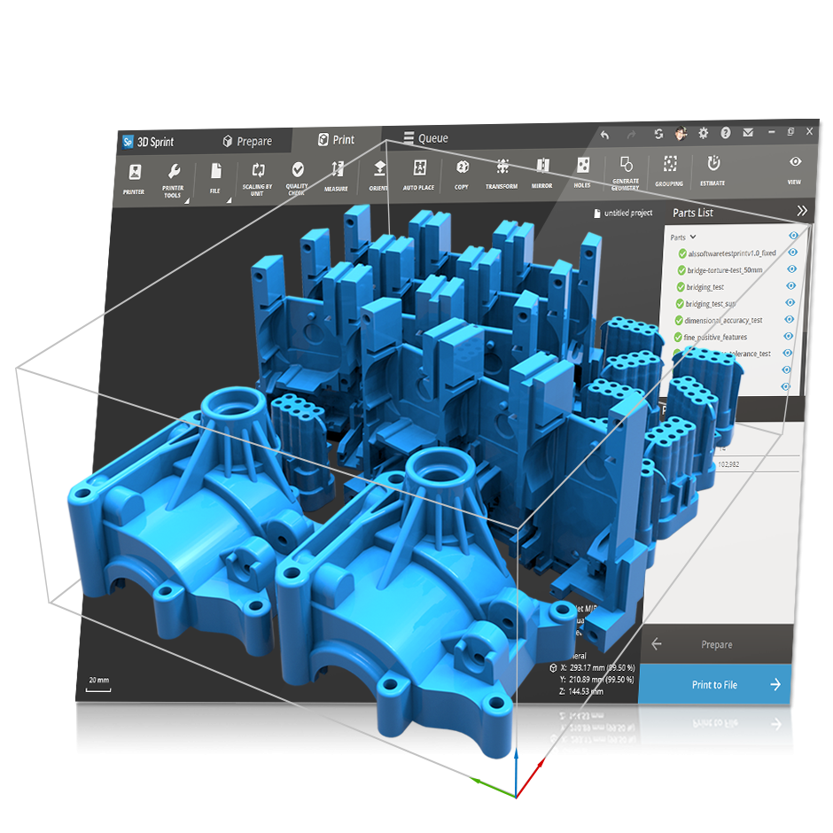 Achieve accurate and powerful slicing and accurate build time and material estimates. Submit print jobs directly from your print workspace or load 3D Sprint build files created on another system directly to the printer. Manage your directly-connected printer or get visibility for all networked or shared printers to control job priorities with queue management tools.